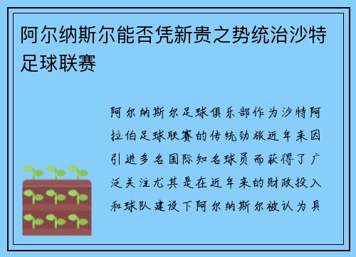 阿尔纳斯尔能否凭新贵之势统治沙特足球联赛