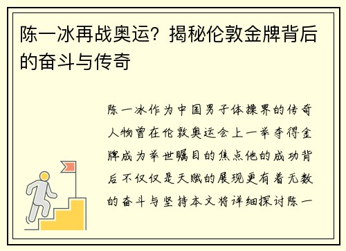 陈一冰再战奥运?揭秘伦敦金牌背后的奋斗与传奇